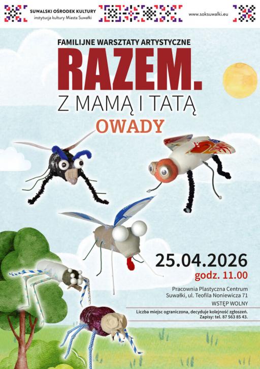 Suwalski Ośrodek Kultury zaprasza dzieci wraz z rodzicami na Rodzinne Warsztaty Artystyczne „Razem. Z Mamą i Tatą – Owady”, podczas których uczestnicy będą mieli okazję wspólnie stworzyć kreatywne formy inspirowane światem owadów. Zajęcia mają na celu rozwijanie wyobraźni, zdolności manualnych oraz budowanie więzi poprzez wspólne, twórcze działania.