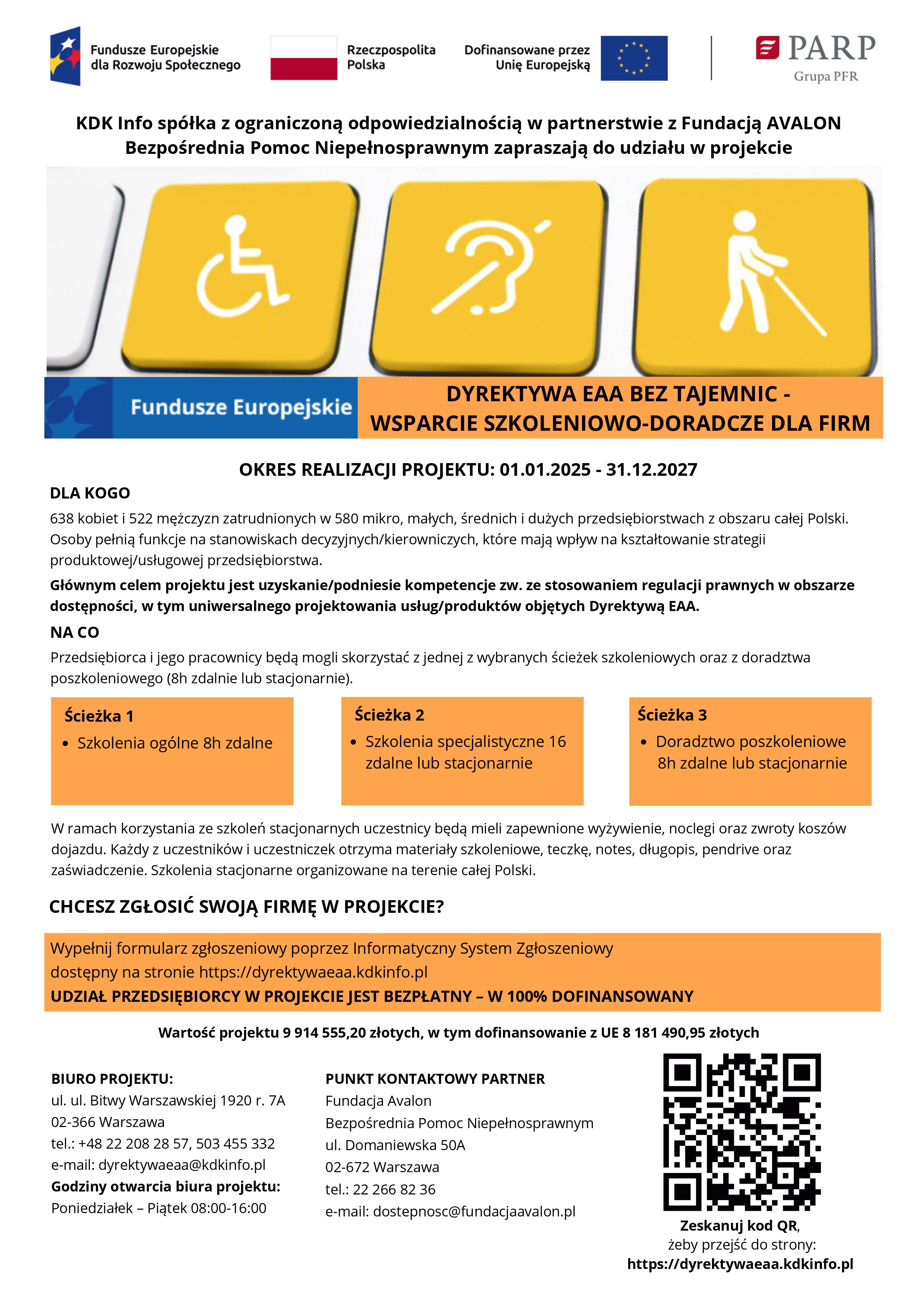 KDK INFO spółka z ograniczoną odpowiedzialnością sp.k. i Fundacja AVALON Bezpośrednia Pomoc Niepełnosprawnym, ogłaszają IX rundę naboru zgłoszeń do projektu „Dyrektywa EAA bez tajemnic – wsparcie szkoleniowo-doradcze dla firm”.