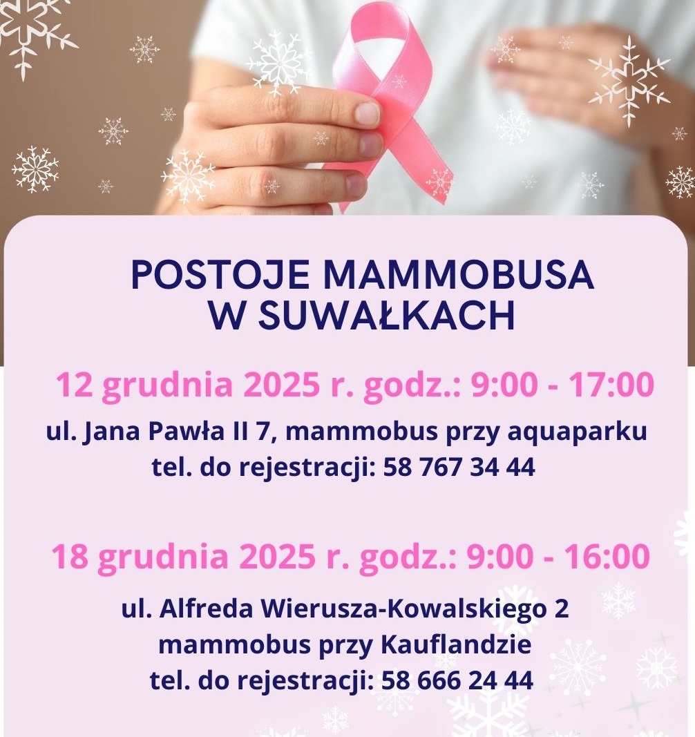 - 18.12.2025 godz.: 09:00 – 16:00, Suwałki, ul. Alfreda Wierusza-Kowalskiego 2, mammobus przy Kauflandzie, tel. do rejestracji: 58 666 24 44