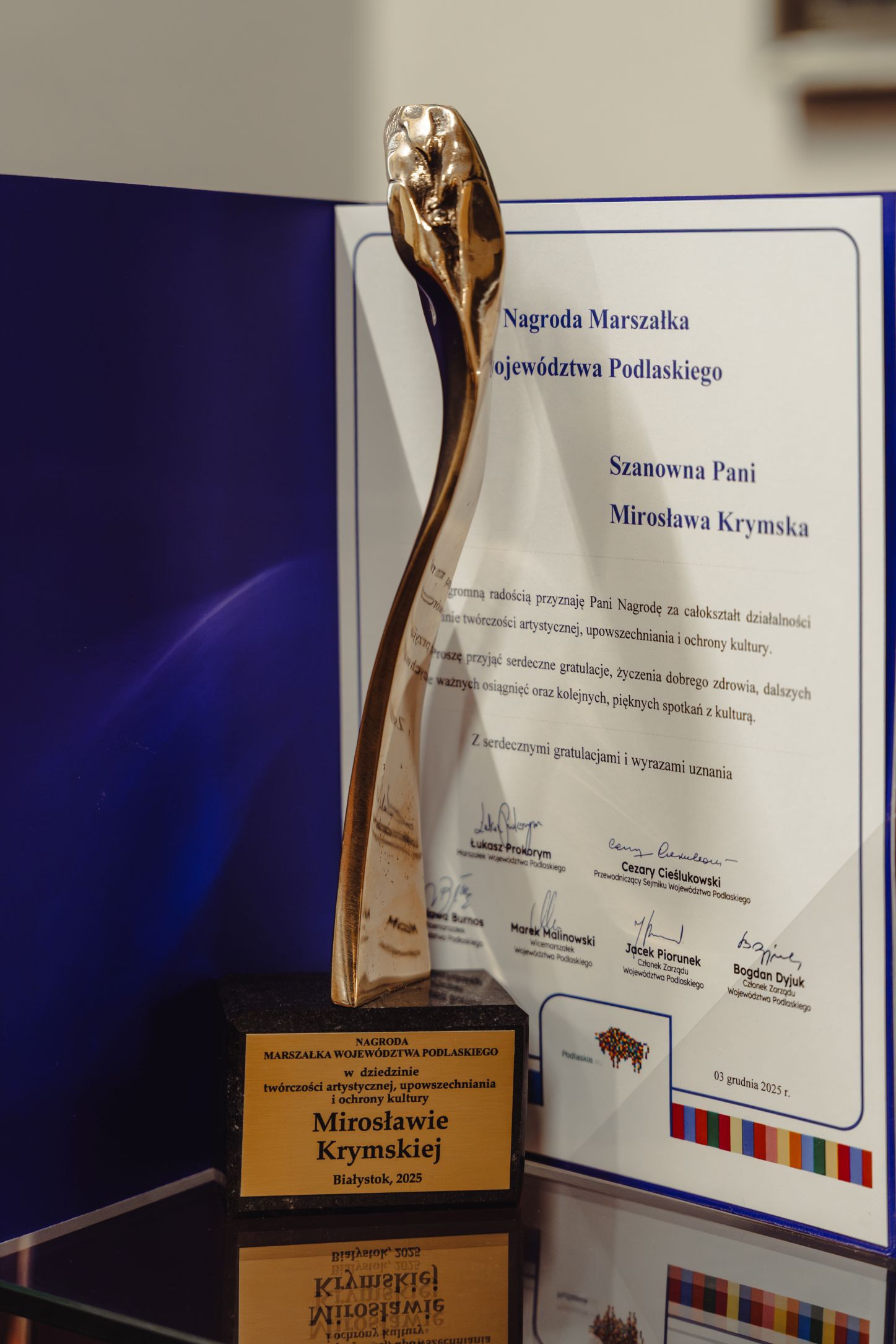 Nagrodę w imieniu laureatki odebrał dyrektor Suwalskiego Ośrodka Kultury, Ignacy Ołów, podczas uroczystej gali, która odbyła się 3 grudnia w Sali Kameralnej Opery i Filharmonii Podlaskiej. Wyróżnienia wręczyli marszałek Łukasz Prokorym oraz członek zarządu Jacek Piorunek.