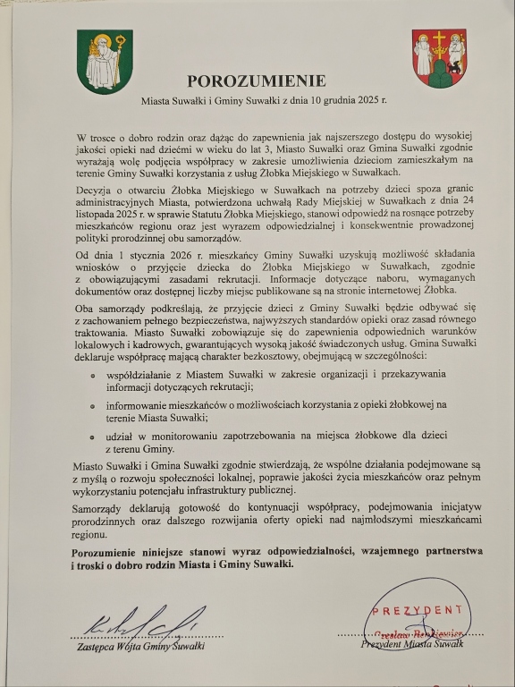 Miasto Suwałki i Gmina Suwałki podpisały porozumienie, którego celem jest umożliwienie dzieciom zamieszkałym na terenie Gminy Suwałki korzystania z usług Żłobka Miejskiego.