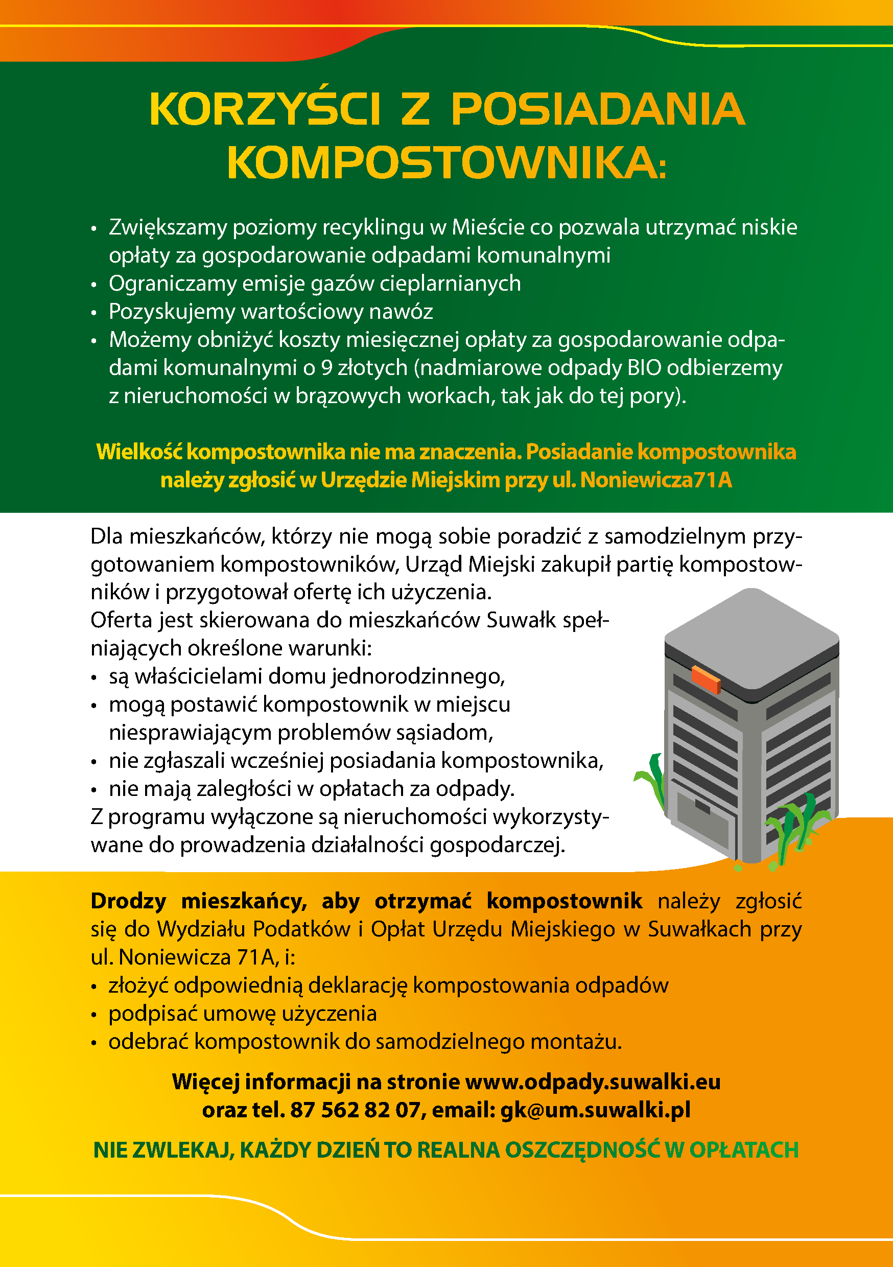 Aby otrzymać kompostownik, należy zgłościć się do Wydziału Podatków i Opłat Urzędu Miejskiego w Suwałkach przy ul. Noniewicza 71A.