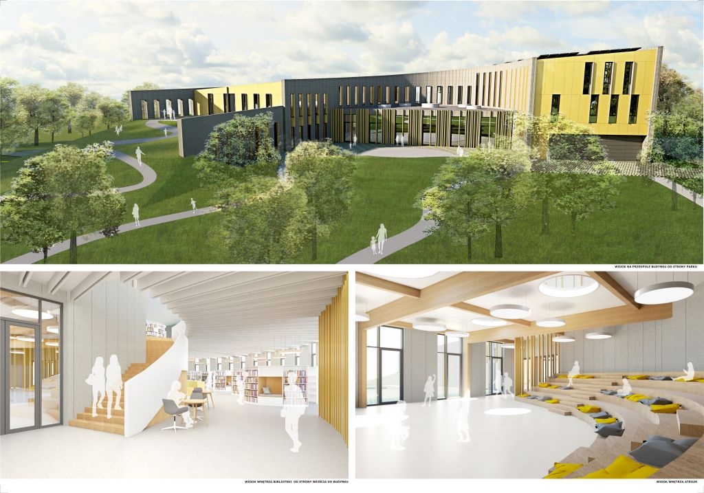 - Strefę multimedialną (pracownie językowe, plastyczne, filmową).