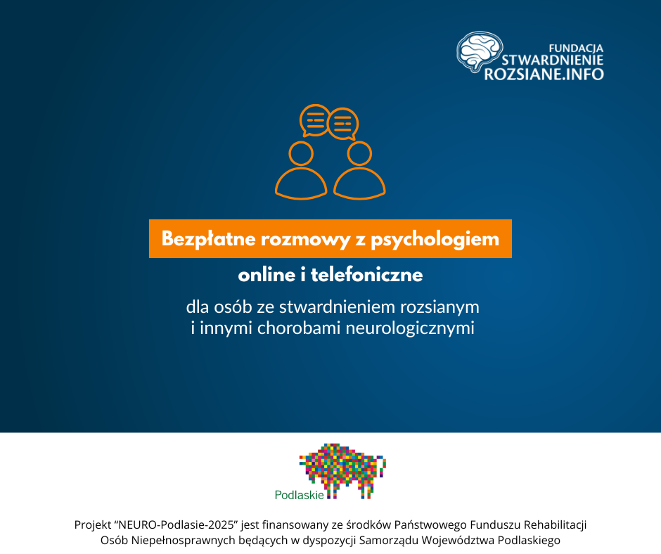 Fundacja StwardnienieRozsiane.info zaprasza osoby z województwa podlaskiego ze stwardnieniem rozsianym oraz innymi chorobami neurologicznymi do skorzystania z dyżurów psychologów. Rozmowy ze specjalistami są bezpłatne.
