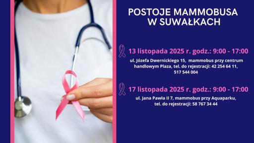 - 17.11.2025 godz.: 09:00 – 17:00, Suwałki, ul. Jana Pawła II 7, mammobus przy Aquaparku, tel. do rejestracji: 58 767 34 44