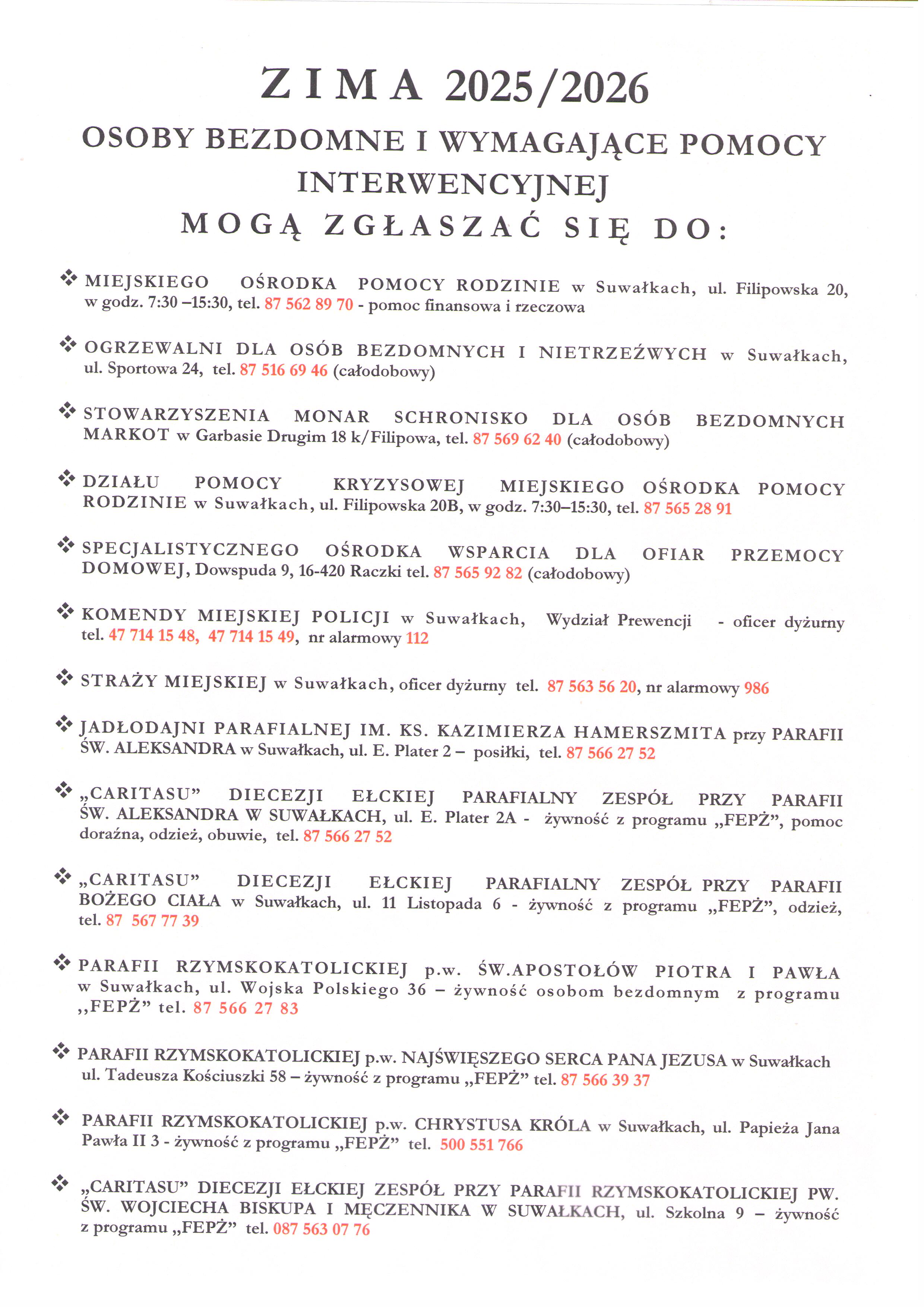 Prosimy by wszelkiego rodzaju sygnały kierować do Komendy Miejskiej Policji w Suwałkach, Straży Miejskiej w Suwałkach lub Miejskiego Ośrodka Pomocy Rodzinie w Suwałkach. Wszelkie prośby o interwencje można zgłaszać pod numer alarmowy 112.
