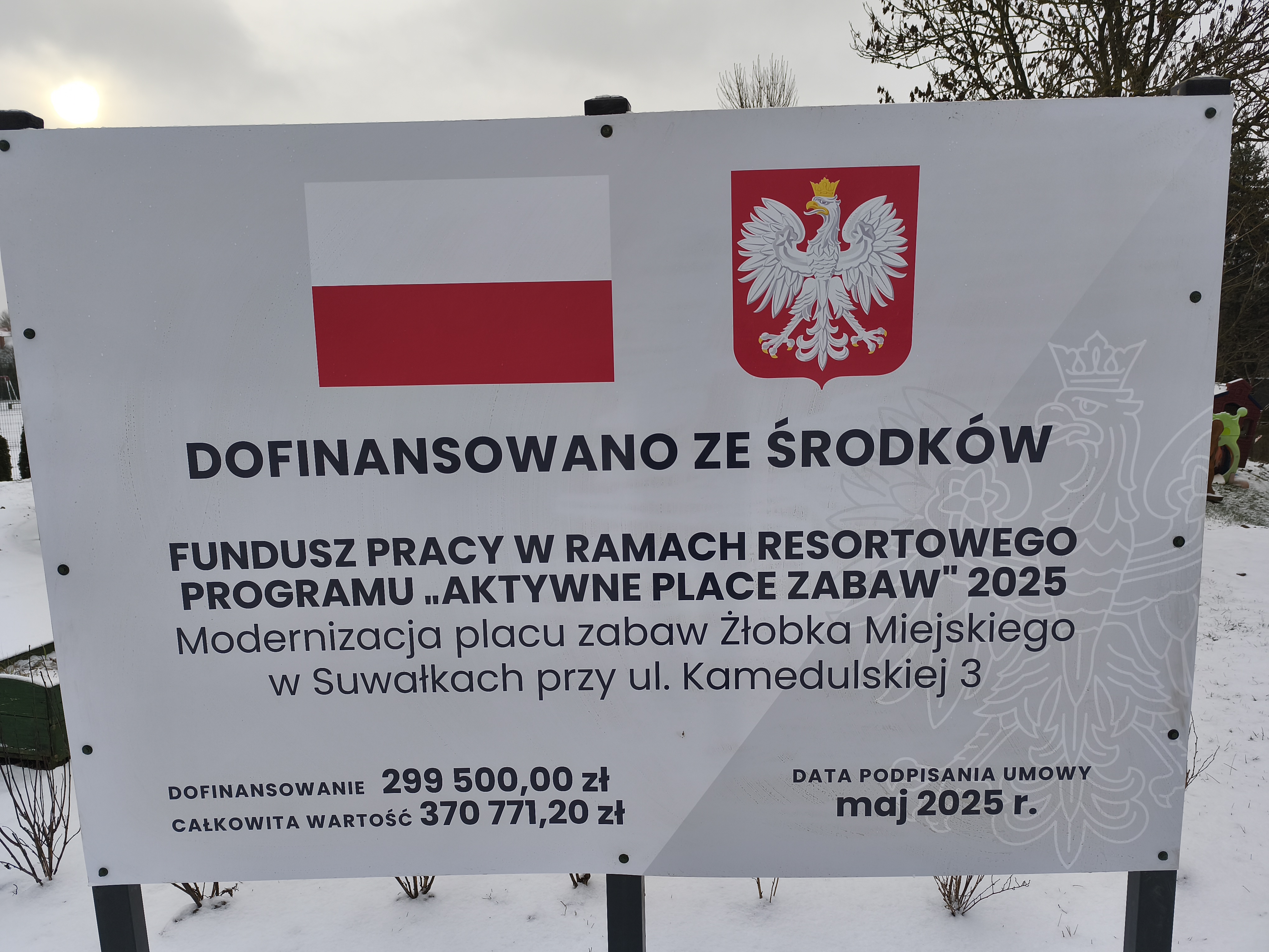 Zadanie inwestycyjne zostało dofinansowane ze środków Fundusz Pracy w ramach Resortowego programu ,,Aktywne Place Zabaw 2025” na podstawie Umowy z Wojewodą Podlaskim nr 24/Plac zabaw/2025.
