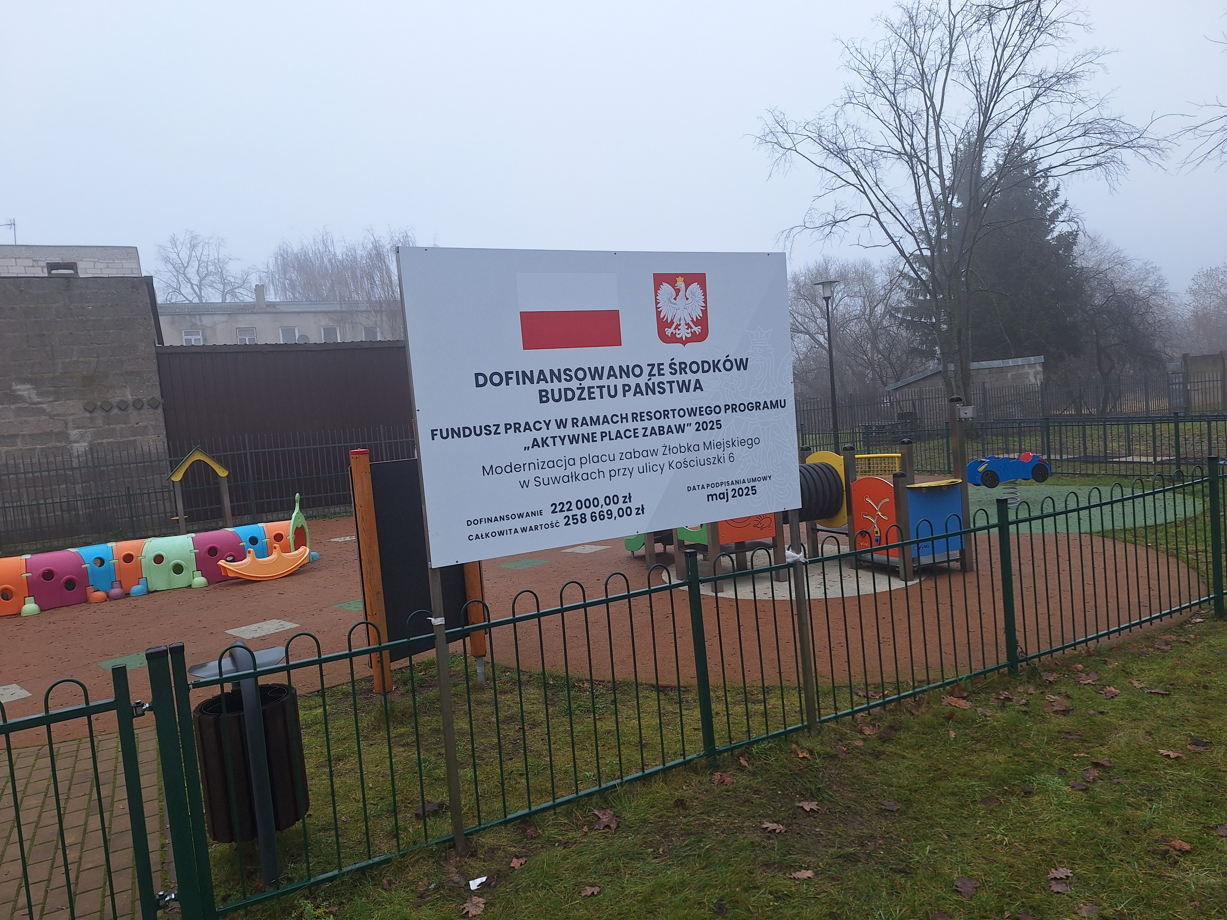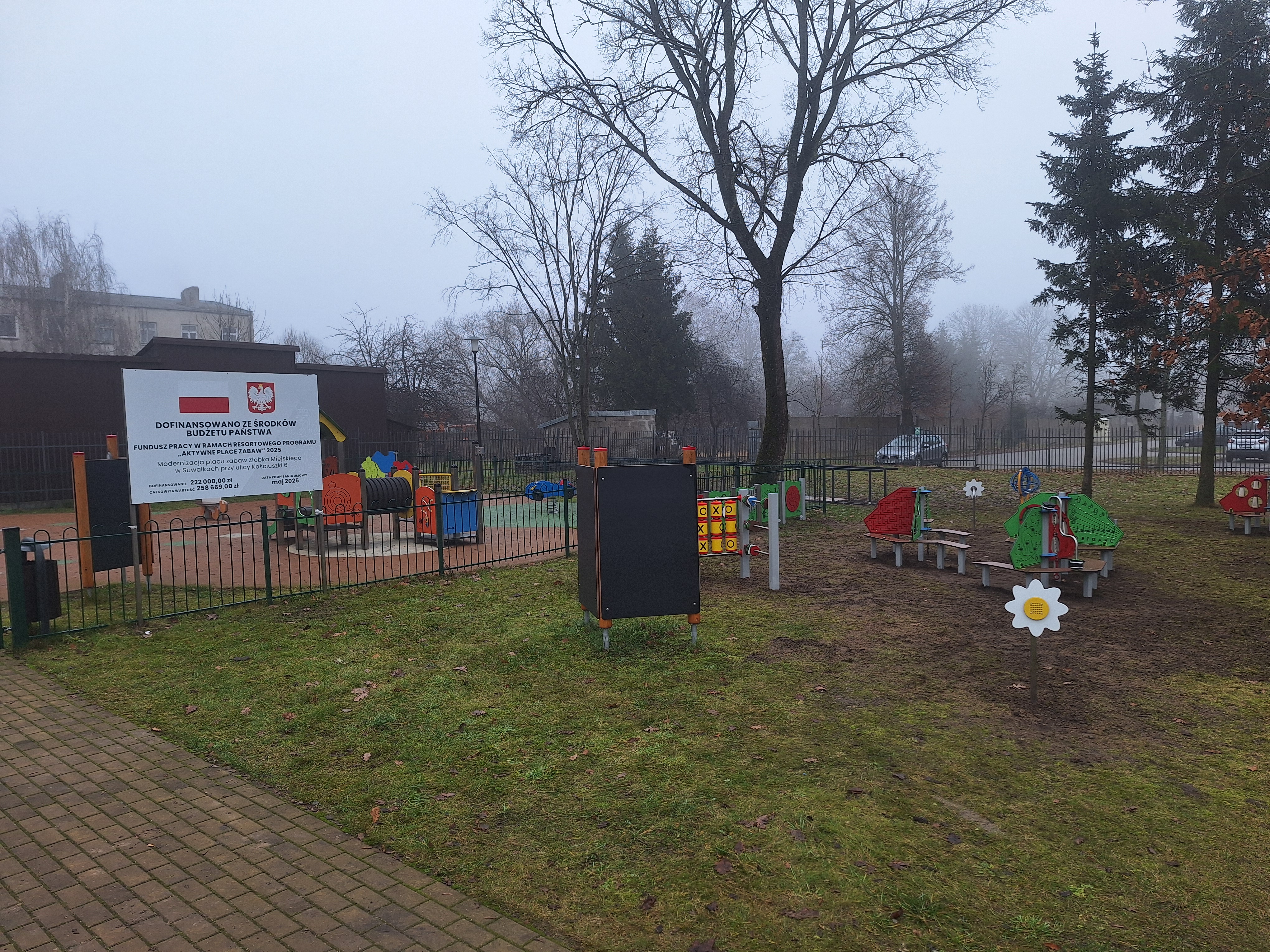Zadanie inwestycyjne zostało dofinansowane ze środków Funduszu Pracy w ramach Resortowego programu ,,Aktywne Place Zabaw 2025” na podstawie Umowy z Wojewodą Podlaskim nr 25/Plac zabaw/2025