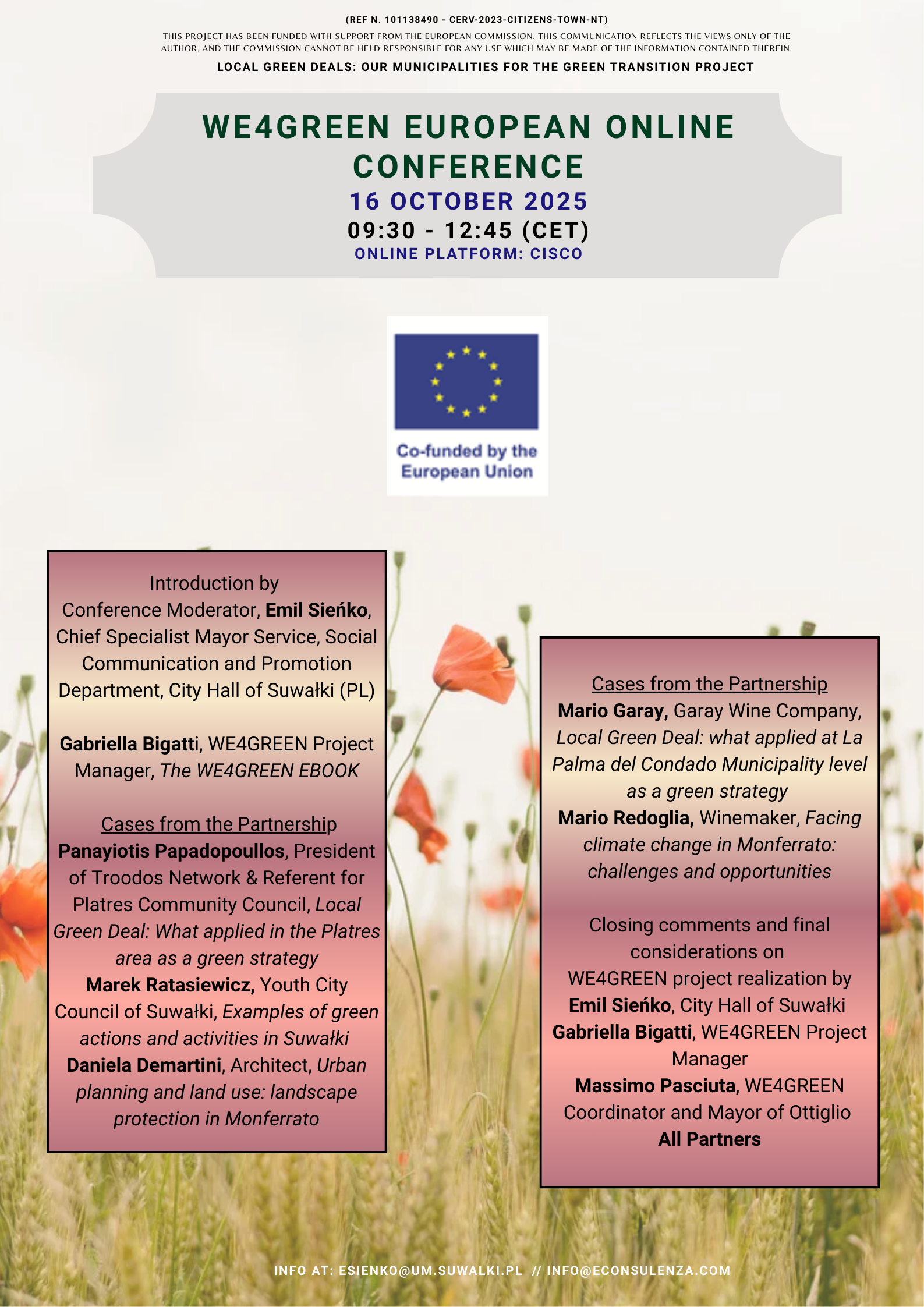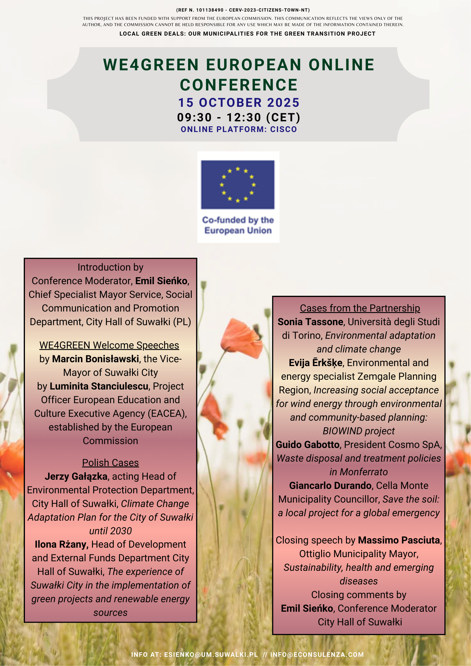 W dniach 15-16 października 2025 r. Miasto Suwałki organizuje konferencję on-line dot. projektu WE4GREEN - LOKALNE ZIELONE ŁADY: NASZE GMINY NA RZECZ ZIELONEJ TRANSFORMACJI.