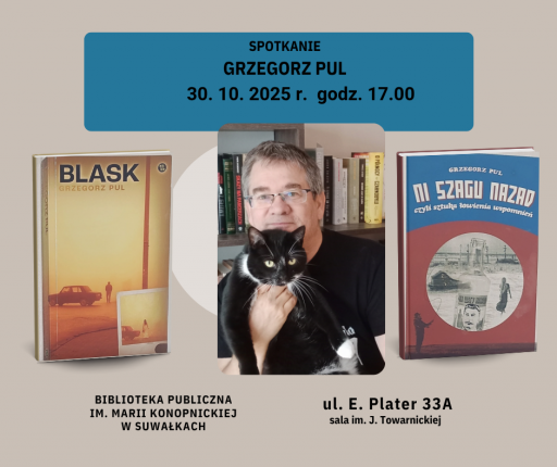 30 października zapraszamy na spotkanie z Grzegorzem Pulem autorem powieści „Ni szagu nazad, czyli sztuka łowienia wspomnień” i „Blask”. Spotkanie odbędzie się o godzinie 17.00 w sali im. Jadwigi Towarnickiej.